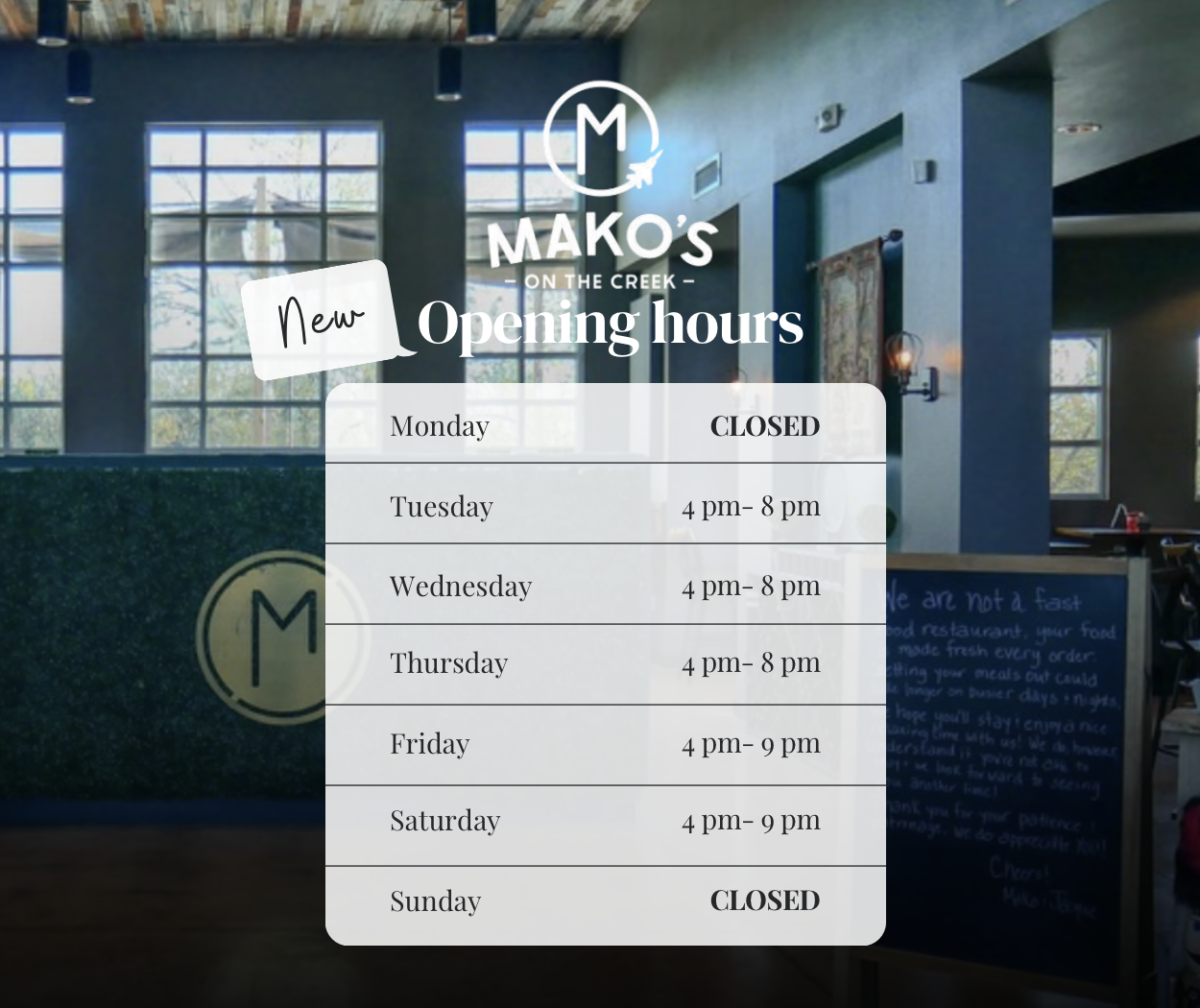 Nestled along the banks of Cibolo Creek, Mako's on the Creek offers a dining experience that is as unique as it is unforgettable. Family and veteran-owned, our locally loved gem offers a scratch-made, seasonally inspired menu that blends elevated American cuisine with the Executive Chef's Trinidadian roots. We offer an atmosphere that is perfect for a special occasion or a casual happy hour. Sip a handcrafted cocktail from our full bar, or enjoy our cozy patio.